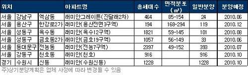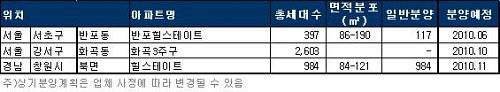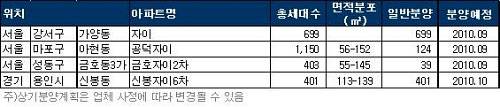 ◆'되는 곳만' 마포, 금호동 가을분양 GS건설 '자이' = GS건설은 올해 서울, 경기 등 수도권에서만 아파트가 분양할 계획이다. 서울에 분양을 앞둔 단지는 재개발, 재건축 아파트로 일반분양물량이 적지만 주요 입지조건이 뛰어나다. 경기도에는 용인시 신봉동에 신봉자이6차가 분양되어 기존 신봉자이1~3차와 함께 대규모 아파트촌을 형성할 예정이다.