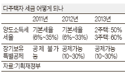 이렇게 적용하면 올해 C아파트를 팔 때 5960여만원, 내년 B아파트를 팔면서 7040여만원, 2013년 A아파트를 처분하면서 580여만원을 각각 내야 해 3채를 모두 파는 데 1억3580여만원의 세금을 부담하게 된다.