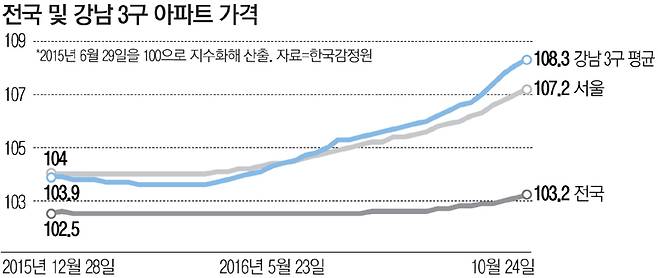 고 원장은 "강남 3구에 대한 분양권 전매제한, 청약 자격 강화, 재당첨 금지 등 투기과열지구 지정에 준하는 수준의 저강도 대책이 가능할 것"이라며 "11월 중순이면 시장이 비수기에 진입하는 데다 미국 금리 인상 예고와 최순실 사태 등 내년 실물경기 둔화와 투자 심리 냉각이 이어질 우려가 있다"고 설명했다.