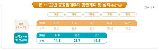 이병훈 국토부 공공주택총괄과 과장은 “서민의 생애주기별 주거안정성을 높이고자 올해 공공임대주택은 전년 목표치인 13만6000호보다 5000호 많은 14만1000호를 목표로 하고 있다”며 “2018~2022년 총 70만2000호 공급을 차질 없이 달성해 나가겠다”고 했다.