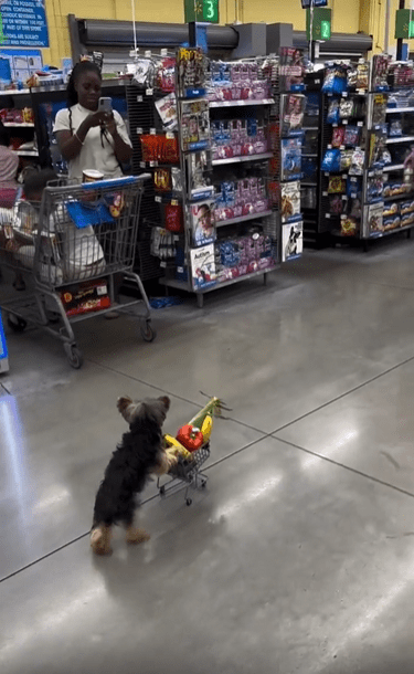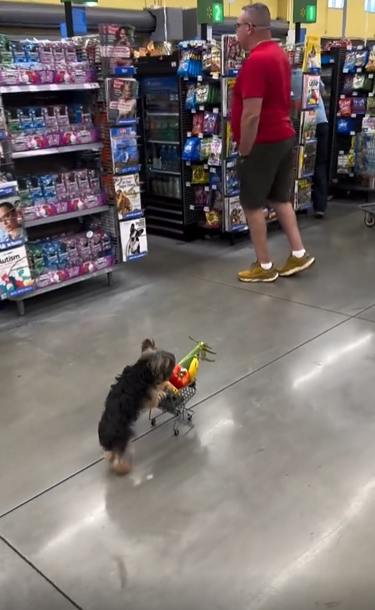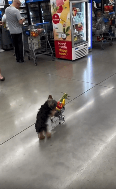작고 귀여운 쇼핑카트를 밀며 걷는 강아지의 의젓한 뒷모습, 오늘의 미션은 식료품 구입!