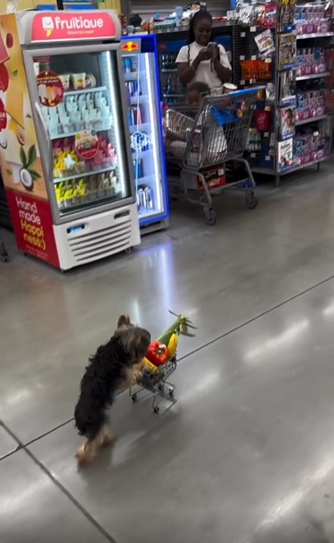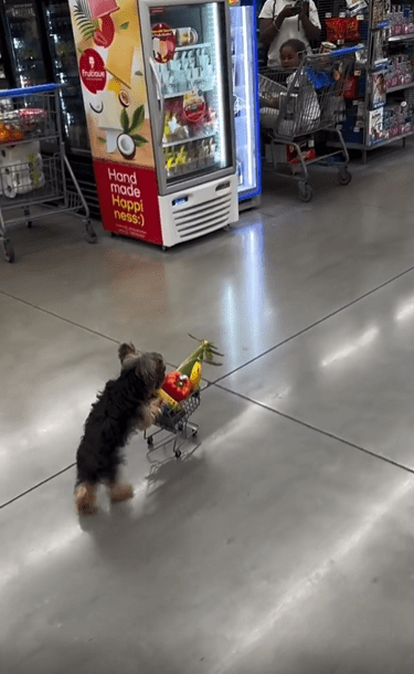 영상은 어딘가 실내 쇼핑몰 같은 분위기의 공간에서 시작됩니다. 바닥은 반들반들한 타일, 뒤로는 제품 진열대들이 줄지어 서 있고, 그 사이로 무언가가 천천히 움직이고 있습니다. 가까이 다가가 보니, 그 주인공은 놀랍게도 아주 작은 강아지. 그리고 그 강아지가 앞쪽을 향해 밀고 있는 건, 미니 쇼핑카트입니다.