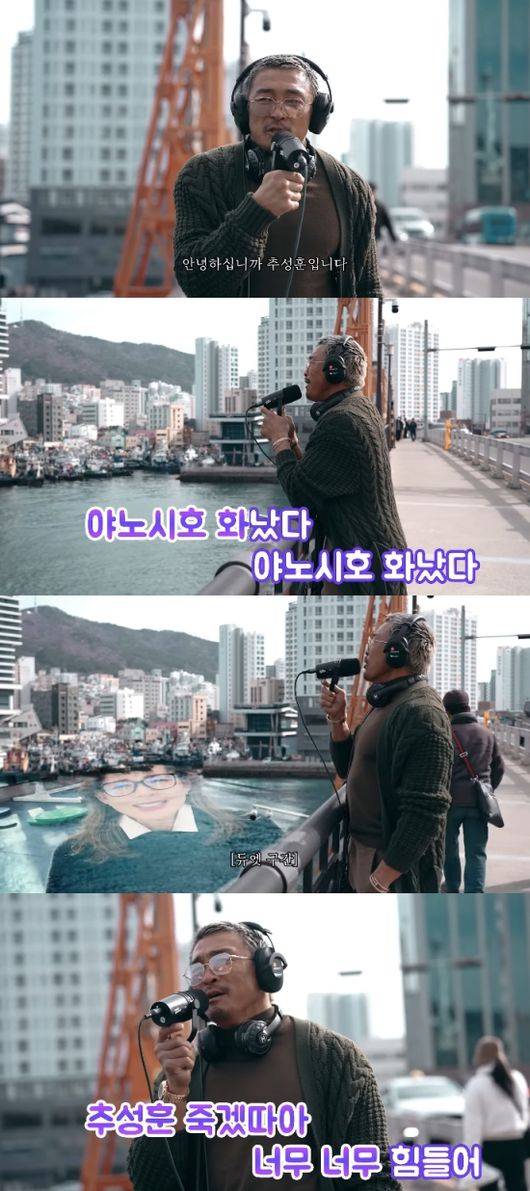 이날 추성훈은 “제가 부산 영도대교다. 여기서 제가 노래 함께 하겠다. 가장 인기 있는 노래를 추성훈인 제가, 아저씨가 부르겠다. 제2고향 부산에서. 시작하겠다”라며 노래를 시작했다.