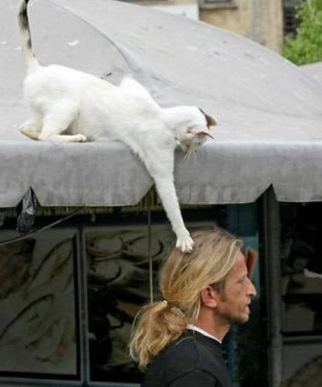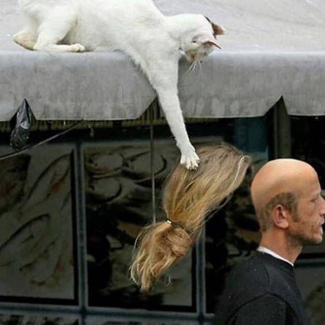 자세히 보면 고양이 앞발이 가발에 닿기는 했지만