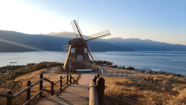 이곳은 다양한 드라마와 예능 프로그램의 촬영지로도 잘 알려져 있는데요. 발 아래로 펼쳐지는 잔잔한 바다와 고즈넉한 풍차의 조화는 많은 여행자들에게 깊은 인상을 남깁니다. 경사가 완만해 천천히 산책하듯 걸으며 여유로운 시간을 보내기 좋고, 바다를 내려다보며 앉아 있으면 자연스럽게 마음도 평온해지는데요. 날씨만 맑다면 멀리 해금강의 윤곽도 확인할 수 있습니다.