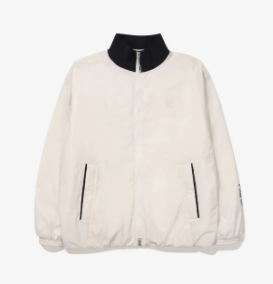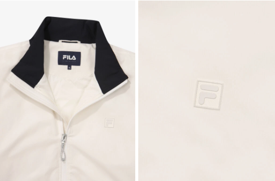 강민경님이 착용한 필라 트랙 패딩 자켓은 화이트와 네이비 배색이 돋보이는 디자인으로, 쌀쌀한 가을부터 겨울까지 가벼운 착용감이 특징입니다. 독일 바이런사의 Comfortemp 충전재를 사용하여 다운 소재 특유의 가볍고 부드러운 촉감을 자랑합니다. 몸판과 소매의 충전재 두께에 차이를 두어 활동성을 높인 점도 인상적입니다.