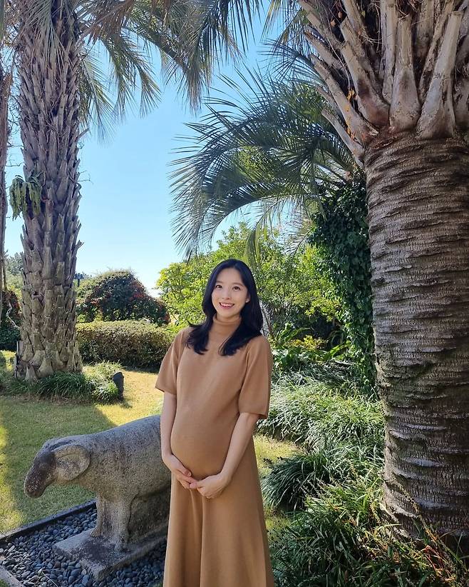 야외에서 촬영된 이 사진에서 이유경 아나운서는 브라운 컬러의 롱 원피스를 착용해 자연스러운 분위기를 연출하고 있다. 여유로운 핏과 심플한 디자인이 편안함을 강조하며, 임신 중에도 세련된 스타일을 유지하는 모습을 보여준다. 배경의 야자수와 조각상, 자연광이 어우러져 한층 더 따뜻하고 평화로운 느낌을 자아낸다