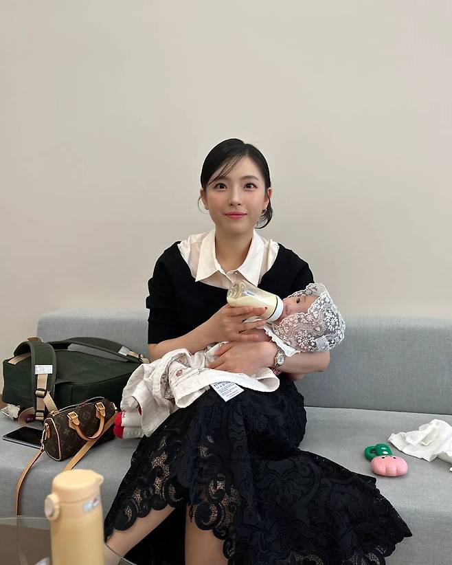 이유경 아나운서는 블랙 레이스 스커트와 화이트 셔츠, 블랙 니트 조끼를 매치해 단정하면서도 클래식한 포멀룩을 선보이고 있다. 깔끔하게 올린 머리와 심플한 메이크업이 단아한 이미지를 강조하며, 명품 핸드백과 액세서리로 고급스러운 무드를 연출한다. 아기에게 분유를 먹이는 모습에서 따뜻함과 프로페셔널한 이미지를 동시에 드러낸다