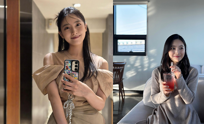 아나운서 이유경이 고급스러운 베이지 컬러의 오프숄더 드레스를 연출하고 있다. 볼륨감 있는 소매와 자연스럽게 떨어지는 실루엣이 우아함을 더하며, 심플한 메이크업과 내추럴한 헤어스타일이 세련된 분위기를 완성한다. 휴대폰 케이스의 다채로운 스티커와 장식 스트랩은 캐주얼한 포인트를 주며, 전체적으로 세련된 미니멀리즘을 보여준다