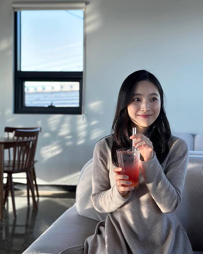 이유경 아나운서는 그레이 컬러의 소프트 니트 원피스를 입고 집에서 여유로운 티타임을 즐기고 있다. 자연스러운 웨이브 헤어와 은은한 미소가 편안한 분위기를 연출하며, 심플한 인테리어와 어우러져 내추럴 홈카페룩의 정석을 보여준다. 전체적으로 차분하면서도 세련된 일상 패션을 완성하고 있다