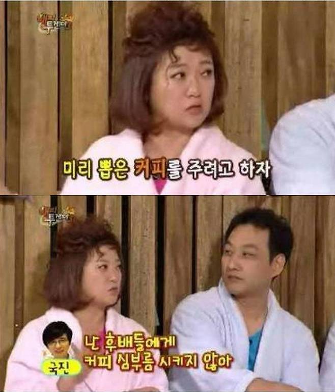 그날도 여느 때처럼 자판기에서 선배들이 마실 커피를 20잔 넘게 뽑고 있었던 김숙. 뒤에서 누군가가 기다리고 있길래 돌아봤더니 바로 5 기수 윗선배인 김국진이었다고, 김숙은 자연스럽게 자신이 미리 뽑은 커피를 건넸지만 김국진은 이를 거절하며 이렇게 말했다고 한다.