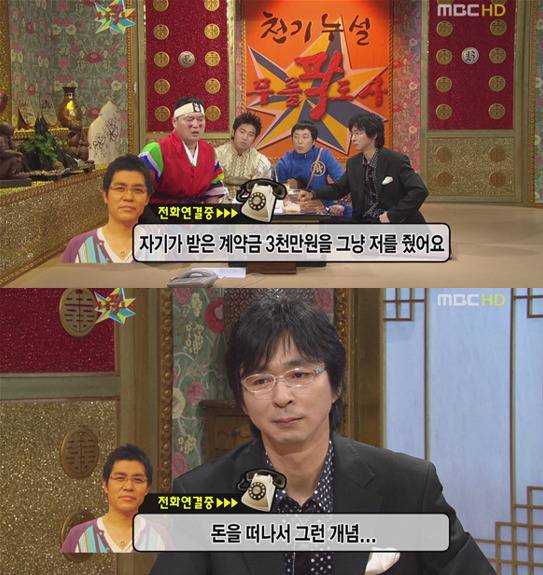 자신이 받은 계약금 3천만 원을 고스란히 김국진에게 내어주었던 것. 이에 김용만은 "돈을 떠나 개념이 다른 사람들과 다르다. 정말 고마운 형"이라고 감사의 마음을 드러냈으며, 김수용 역시 결혼 당시 경제적으로 무척 어려운 상황이었는데 김국진이 신혼여행 경비 전액을 송금해 주었다는 사실을 전한 바 있다.