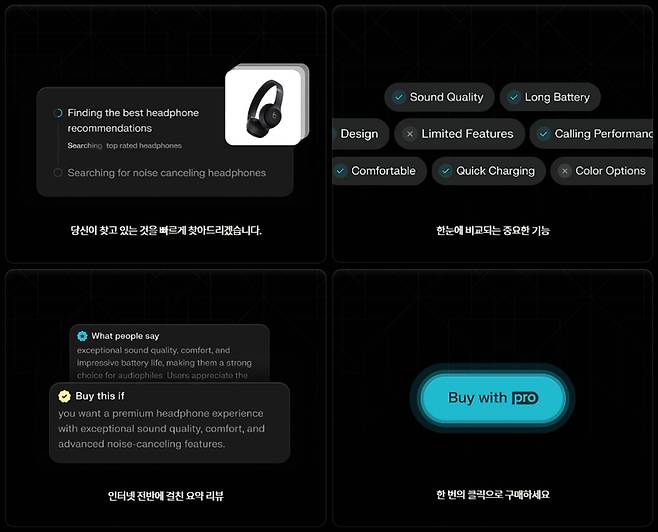 퍼플렉시티가 최근 쇼핑 기능을 도입했거든요. 사용자가 쇼핑 관련 검색어를 입력할 경우 상품의 이미지, 가격, 판매자 정보, 간단한 설명, 장단점 등을 카드 형식으로 제공하면서 클릭 한 번으로 구매까지 완료할 수 있는 시스템을 구축했습니다.