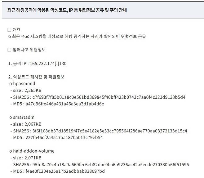 KISA는 공지에서 "최근 주요 시스템을 대상으로 해킹 공격을 하는 사례가 확인돼 위협 정보를 공유한다"고 밝혔다.