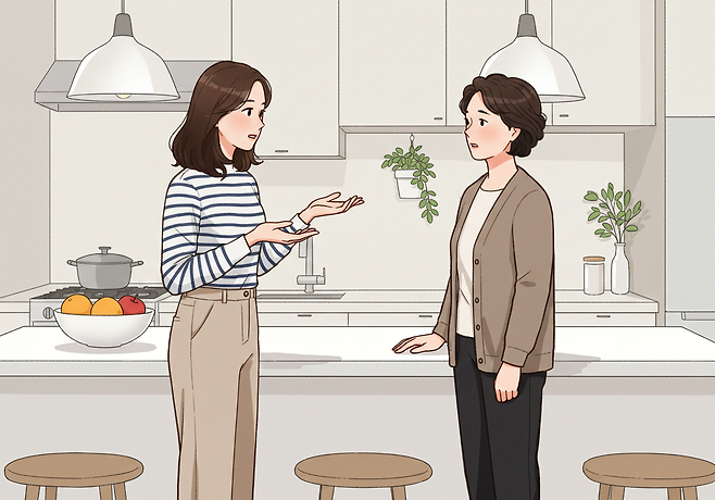 불편한 주제가 나왔을 때는 “저는 조금 다르게 해보고 있는데요, 어머니 말씀도 참고할게요”처럼 상대를 존중하면서도 자신의 방식을 지켜낼 수 있는 말투를 익히는 게 중요합니다.