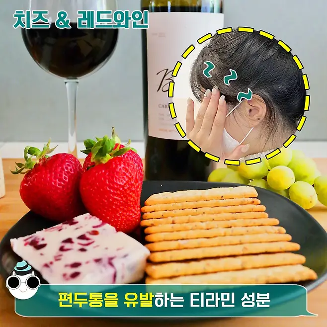 티라민을 많이 가진 대표적인 음식이 바로 레드와인과 치즈 그리고 버터에요. 찰떡궁합으로 알려진 와인과 치즈가 편두통을 유발한다니..ㅇ_ㅇ 따라서 평소 편두통이 있던 분은 조심해서 드시는 게 바람직해요.
