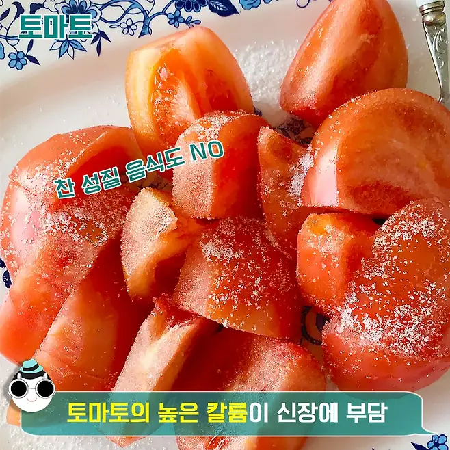 또한 신장 질환을 가진 분들은 찬 음식을 피해야 하는데요. 토마토 역시 찬 성질을 가진 음식에 속해요. 생체소와 생과일을 많이 먹으면 몸의 체내 온도를 떨어뜨리고, 신장 기능이 저하될 수도 있어요.
