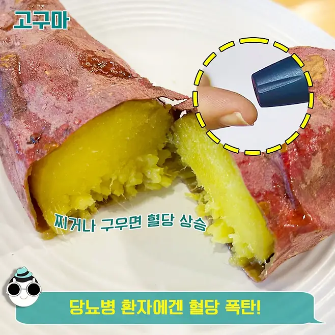 탄수화물도 다른 작물보다 많이 들어있는 편. 따라서 당뇨병 환자가 아무 생각 없이 고구마를 섭취하게 된다면 위험할 수 있어요. 꼬옥 환자 본인에게 맞는 혈당을 체크해 적정량만 섭취하도록 해요.