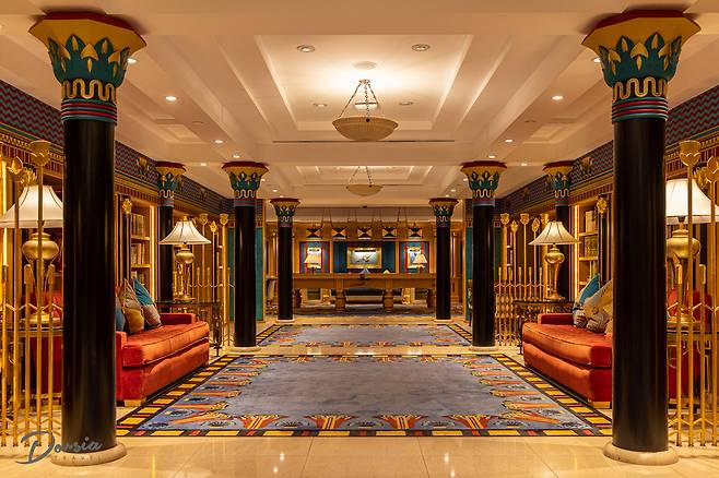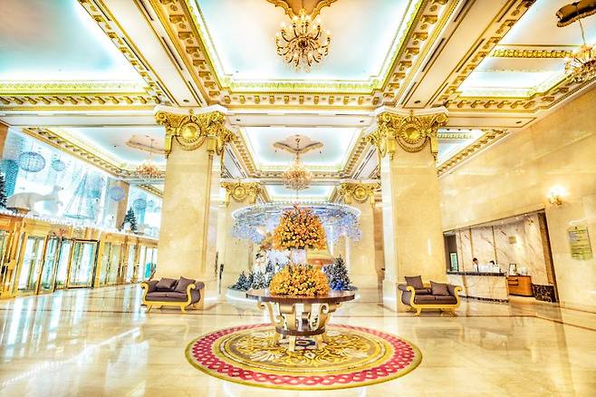 호텔 로비에는 무려 높이 30m의 황금 기둥 발코니가 있고, 기둥은 전부 24K 금으로 장식돼 있습니다. 실크 카펫에는 금가루가 잔뜩 뿌려져 있죠.