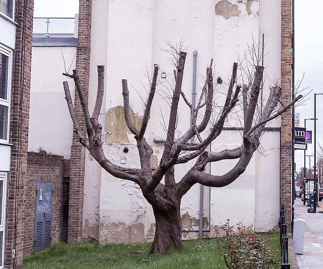 뱅크시의 가장 최근 작품. 죽은 나무 뒤에 초록색 페인트 벽화를 칠해 살아 있는 나무인 것처럼 보이죠?