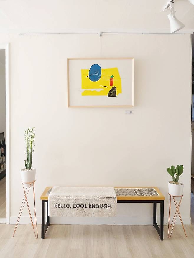 구성이 간단해 보이지만 판화답게 절제된 색감과 심플하지만 오묘한 구성으로 여러 인테리어와 정말 잘 어울리는 작품입니다. 강호연 작가님은 작품에 공동체 속에서 살아가는 현대인들의 관계에서 오는 경험과 감정들을 주관적인 시각으로 표현하고, 또 의사소통에서 오는 어려움을 시각화하시는데요,