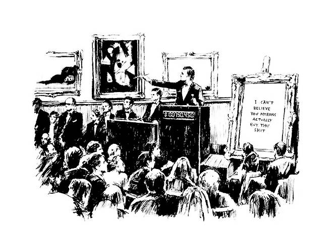 사실 뱅크시의 작품이 높은 경매가로 낙찰된 것은 이번이 처음이 아닙니다. 이미 2006-07년 경, 소더비 경매를 통해 종이에 실크스크린 한 작품들이 팔린 바 있습니다. 그중에는 미국 유명 팝가수 크리스티나 아길레라도 포함되어 있었죠. 하지만 뱅크시는 경매 둘째 날에 아래와 같은 그림을 올렸습니다. "진짜 이런 쓰레기를 돈 주고 사는 바보가 있다니"