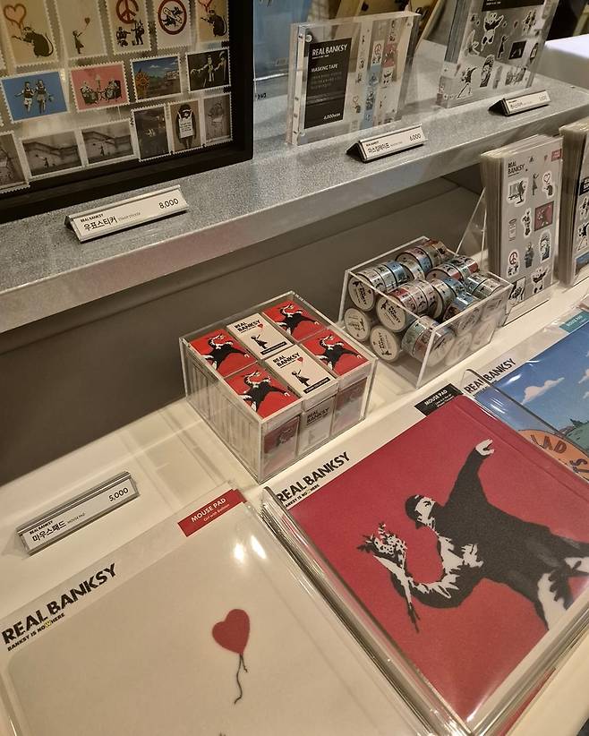 살 만한 굿즈도 많았고, 모작 체험하시는 분들 보니 재밌어 보이더라고요. 전시장 곳곳, 계단까지 깨알같이 숨겨져 있는 작품 찾아보는 것도 재미있었고, 엄숙하지 않은 캐주얼한 분위기에서 여기저기 기념사진을 찍으니 마치 '뱅크시 월드'에 들어가 있다는 기분이랄까요?