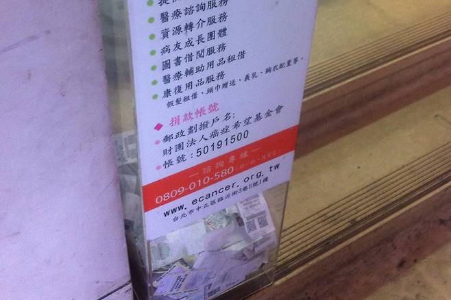 대만에서는 영수증을 불우이웃에게 기부하기도 합니다. 길거리를 걷다 보면 영수증 모금통을 쉽게 볼 수 있는데요.