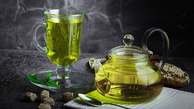 녹차에는 풍부한 카테킨이 들어 있어 혈관을 탄력 있게 유지하고 염증을 완화합니다. 다만 카페인이 함유되어 있어 오전이나 점심 식사 후에 마시는 것이 가장 적합합니다.