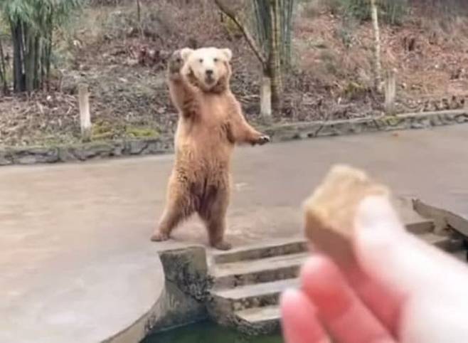 사연은 이렇습니다. SNS상에는 관람객의 손에 쥔 간식을 보더니 "어서 빨리 던져!"라고 손짓하는 곰의 모습이 담긴 영상이 올라왔죠.