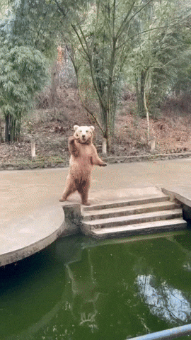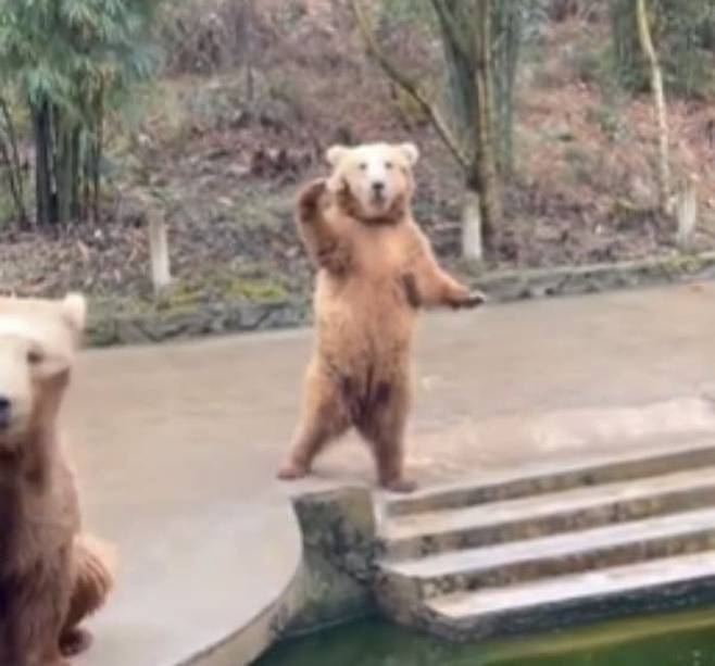 중국 남서부 원구이고원에 위치한 구이저우 삼림 동물원(贵州森林野生动物园)에서 촬영된 것으로 알려진 영상 속에서 곰은 두 발로 벌떡 일어서 있었습니다.