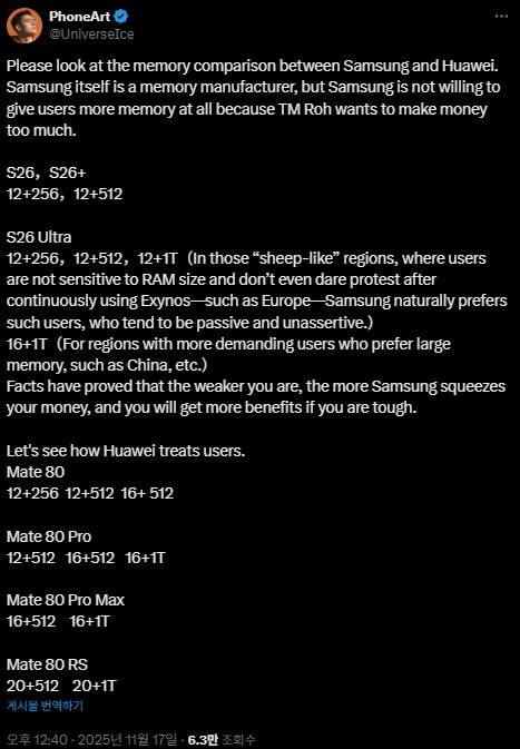 그렇다면 왜 삼성은 글로벌 모델에 16GB 램을 확대하지 않았을까요? Ice Universe에 따르면, 삼성은 지역별 사용 패턴을 보고 전략을 나눈 것으로 보입니다. 대부분 지역의 사용자는 더 높은 램 용량에 대한 요구가 크지 않고, 상대적으로 “수동적”인 사용 성향을 보이며, 반면 중국 사용자는 고용량 램, 고사양 옵션에 대한 요구가 더 뚜렷하고, 스펙 경쟁에 민감한 편이라고 합니다. 그래서 글로벌 모델은 12GB 램만 유지하면서, 중국 시장에는 16GB + 1TB라는 ‘플래그십 중의 플래그십’ 모델을 따로 준비한 것으로 풀이됩니다.