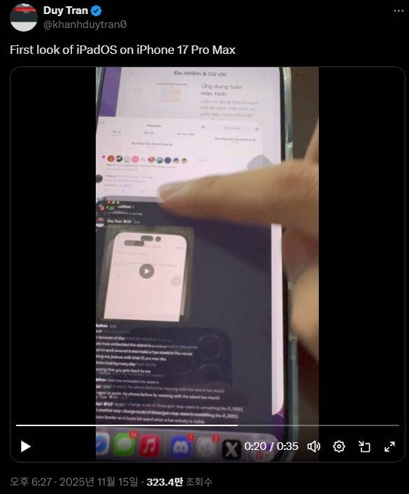 GeoSn0w의 설명과 함께, 개발자 Duy Tran(@khanhduytran0)는 X(구 트위터)에 시연 영상을 올렸습니다. 여기서 아이폰 화면에는 원래 아이패드에서만 볼 수 있는 요소들이 등장합니다. 예를 들면 창 형태로 떠 있는 앱들, 화면에 고정해 둔 앱(핀 앱), 오버레이 앱, 화면 공유와 함께 뜨는 PIP(픽처 인 픽처) 미러링, 아이패드OS 스타일의 도크, 스테이지 매니저 조작 인터페이스 등입니다.
