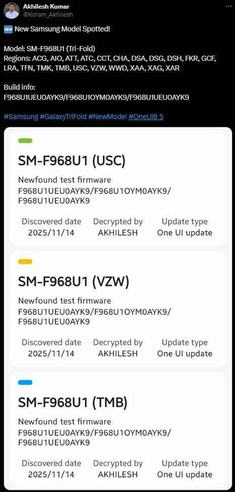 X(구 트위터)에서 활동 중인 Koram Akhilesh가 공개한 정보에 따르면 최근 삼성 서버에서 SM-F968U1이라는 테스트 펌웨어가 포착됐다고 합니다. SamMobile은 이 모델 번호가 미국에서 판매되는 언락용 갤럭시 Z 트라이폴드 버전과 연결된다고 해석하고 있습니다.