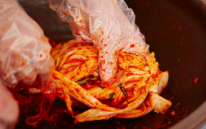 김치를 꺼낼 때 젓가락이나 집게로 여기저기 파헤치면 양념층이 흐트러져 맛이 빨리 변합니다. 먹을 만큼만 덩어리째 꺼내고, 남은 김치는 양념이 겉면을 고르게 덮도록 다시 정리하는 것이 좋습니다.