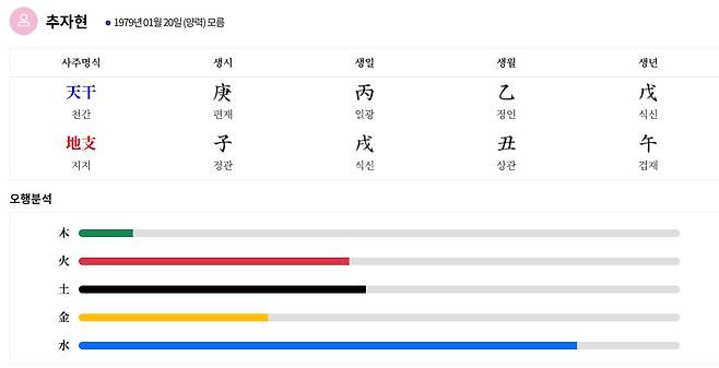 본 내용은 포털 등 미디어상에 공개된 스타들의 생년월일을 기반으로 사주명리학에 의거한 결과입니다.