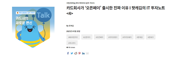 바로 얼마 전에는 저희 필진 팟캐김이 신용카드사들의 ‘오픈페이’ 상품에 대해 썼고요. 이 글을 보면 카드사들의 미래가 얼마나 암울한지, 그리고 간편결제 시장의 경쟁이 어떻게 치열하게 이루어지고 있는지를 알 수 있어요.