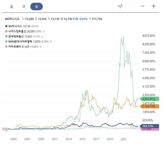 금융 섹터 안에서 투자자에게 가장 큰 수익을 준 분야는 은행도 아니고 카드사도 아닌, 다름아닌 간편결제 분야예요. 최근 1~2년 사이 카카오페이가 높은 공모가와 주가 급락 때문에 이미지를 망쳐놔서 그렇지, NHN한국사이버결제, 나이스정보통신, 한국정보통신, 다날, KG이니시스 등 전통의 간편결제 업체들은 아래 주가차트에서 보듯 시장의 성장과 함께 투자자와 주주들에게 큰 수익을 안겨주었습니다.