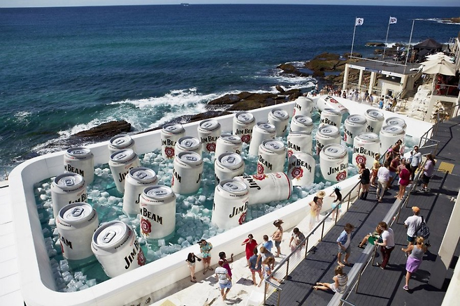 바다를 기반으로 한 이 ‘수영장 복합 단지’는 인플루언서만을 끌어들인 게 아니에요. 본다이 배스의 매력과 가치를 알고있는 기업들도 한껏 입장시키고 있죠. 위스키 브랜드 짐빔은 BIC의 배스 전체를 짐빔을 위한 ESKY로 만든 바 있어요. 이름하여 세계에서 제일 큰 자이언트 ESKY! 참고로 ESKY는 호주에서 아이스박스의 동의어로 통할 만큼 유명한 호주의 보냉기 브랜드예요.