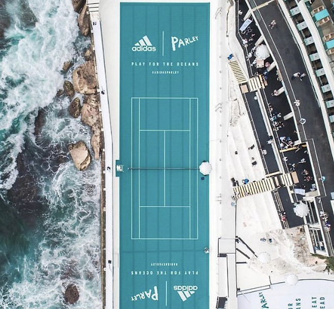 대표적인 예는 아디다스의 신제품 홍보였어요. 2019년, 아디다스는 재활용 플라스틱 폐기물로 만든 테니스 의류와 신발을 홍보하기 위해 본다이 배스를 오픈 코트로 만들었어요. 그해 실제 호주 오픈에서는 선수들이 이 의류를 입고 경기를 뛰었죠. 아디다스는 일찍이 플라스틱 사용을 중단하고 지속가능한 메시지를 전달하겠다고 선언한 브랜드 중 하나예요.