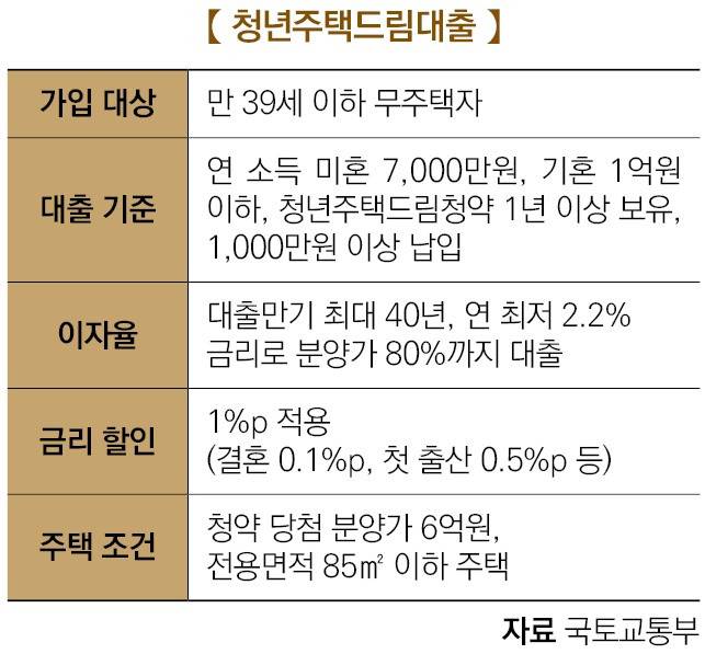정부는 올해 4월부터 청년주택드림통장을 이용해 청약에 당첨된 20~39세 청년에게 분양 대금의 최대 80%를 최저 연 2.2% 저금리로, 만기 최장 40년까지 대출해 주는 청년주택드림대출을 시행한다. 최대 3억원까지 대출받을 수 있으며 신혼부부의 경우 4억원까지 대출한도가 적용된다.
