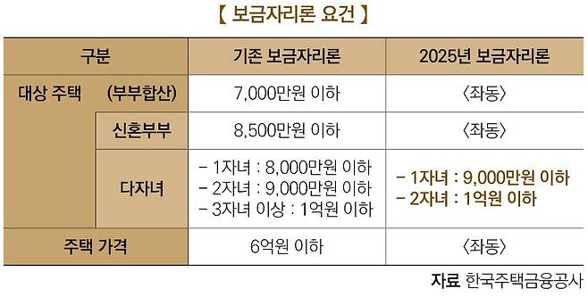 2025년 4월부터 두 자녀 이상 가구도 한국주택금융공사의 보금자리론을 이용할 때 우대금리를 받는다. 1·2자녀 가구가 보금자리론을 신청할 때 부부 합산 소득 요건도 완화된다.