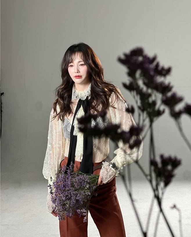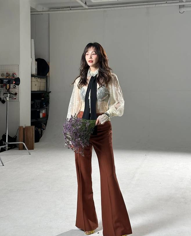 안혜경은 브라운 부츠컷 팬츠에 레이스 블라우스를 매치해 빈티지하면서도 세련된 감성을 연출했으며, 블랙 리본 타이로 포인트를 더해 우아한 매력을 강조했습니다.