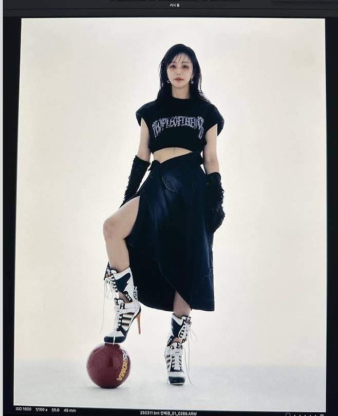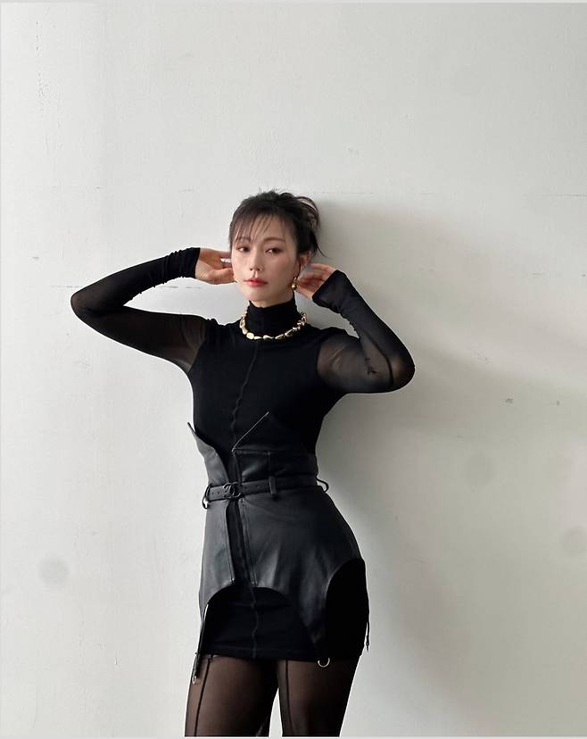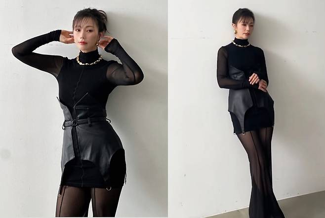 또 다른 룩에서는 올블랙 시스루 탑과 가죽 코르셋 미니원피스를 매치해 강렬한 시크룩을 완성했습니다.