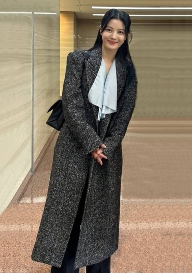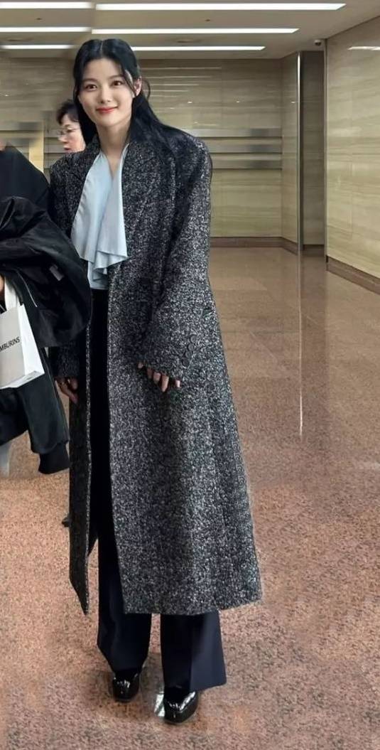 이날 결혼식에서 김유정은 블루 컬러의 리본 블라우스와 헤링본 소재의 맥시 테일러드 코트를 매치한 시크한 하객룩을 연출해 주목을 받았다.