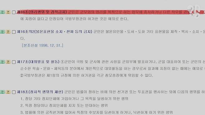 “본인의 신분을 유지할 수 있는 맞는 판단을 하라는 일종의 권고사항으로 보시면 되고 사실 젊은 장병들이 알바하는 것을 ‘너 현역 신분이니까 이중경제활동을 해선 안 돼’라고 강요하는 것은 전체적인 간부나 포괄적으로 하는 권고 개념이고 사실 이런 것을 불법 개념으로 보긴 어렵다는 거죠.”
