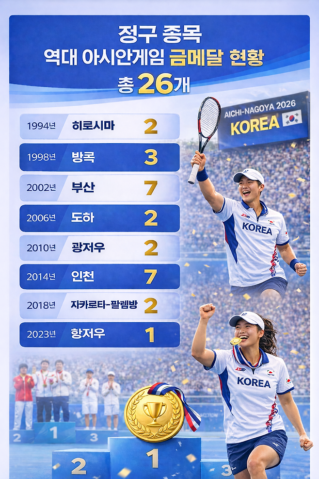 한국 정구는 늘 조용히, 그러나 가장 찬란하게 아시안게임 무대를 물들여 왔습니다. 스포트라이트는 크지 않았지만, 코트 위에서 흘린 땀과 눈물은 언제나 금빛 결실로 돌아왔습니다.