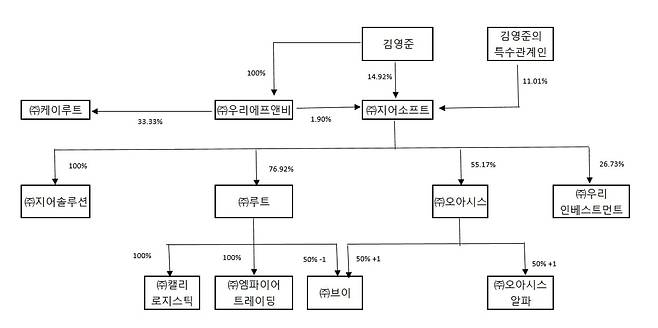 지어소프트테크는 오아시스 지분을 55.2%, 루트의 지분 76.9%를 보유하고 있지만, 오아시스와 루트는 관계사다.