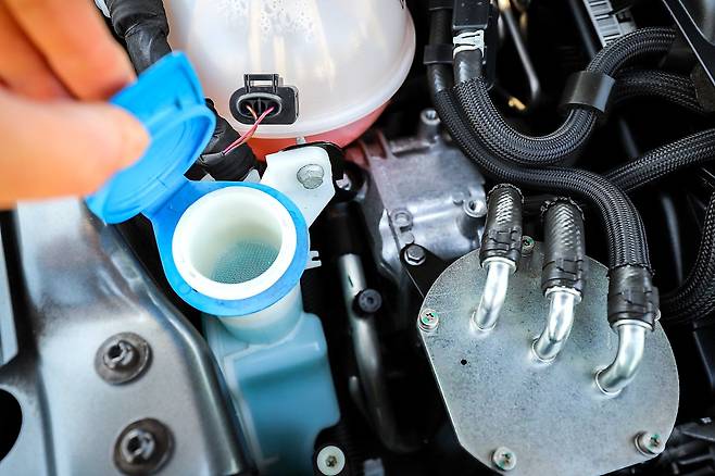 와이퍼로 전면 유리를 닦게 되면 대부분은 깨끗해지지만 와이퍼만으로 닦이지 않는 경우에는 워셔액을 사용하여 닦게 되면 깨끗해지는데요, 워셔액이 워셔액 통에 정량이 들어있는지 확인을 해야 하며 워셔액은 엔진룸을 열었을 때 파란색 뚜껑에 WASHER ONLY라고 적혀있는 부분이 워셔액 통입니다. 워셔액은 정량이 보충이 되어있는지 확인하고, 부족한 경우 보충을 해주어야 합니다.