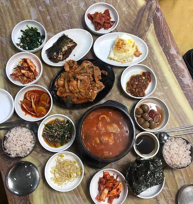 제육볶음을 시키면 김치찌개를 주는 목포 토박이 추천 맛집 상락동 '꽃돼지식당'. 제육 백반을 주문하면 김치찌개를 함께 내어주는데 서비스라 믿기 어려울 정도로 맛이 좋다. 직접 담근 묵은지와 돼지고기를 아낌없이 넣어 푹 끓인 김치찌개는 깊은 맛으로 메인 메뉴라고 해도 이상하지 않을 정도. 텁텁하지 않고 깔끔한 제육볶음 또한 밥도둑이 따로 없다. 거기에 계란후라이, 고등어구이, 각종 나물, 소세지볶음 등 남도의 손맛이 가득한 밑반찬 또한 10가지가 넘는다니 가성비 제대로 갖춘 혜자 맛집이다.